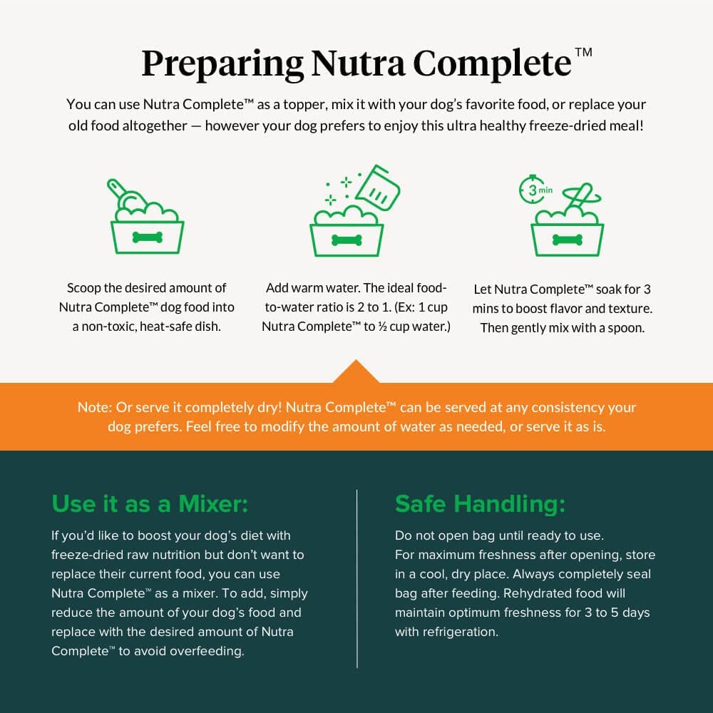 • USE AS FOOD OR AS MIXER – If you’d like to boost your dog’s diet with freeze-dried raw nutrition but don’t want to replace their current food, you can use Nutra Complete as a mixer. To add, simply reduce the amount of your dog’s food and replace with the desired amount of Nutra Complete to avoid overfeeding.