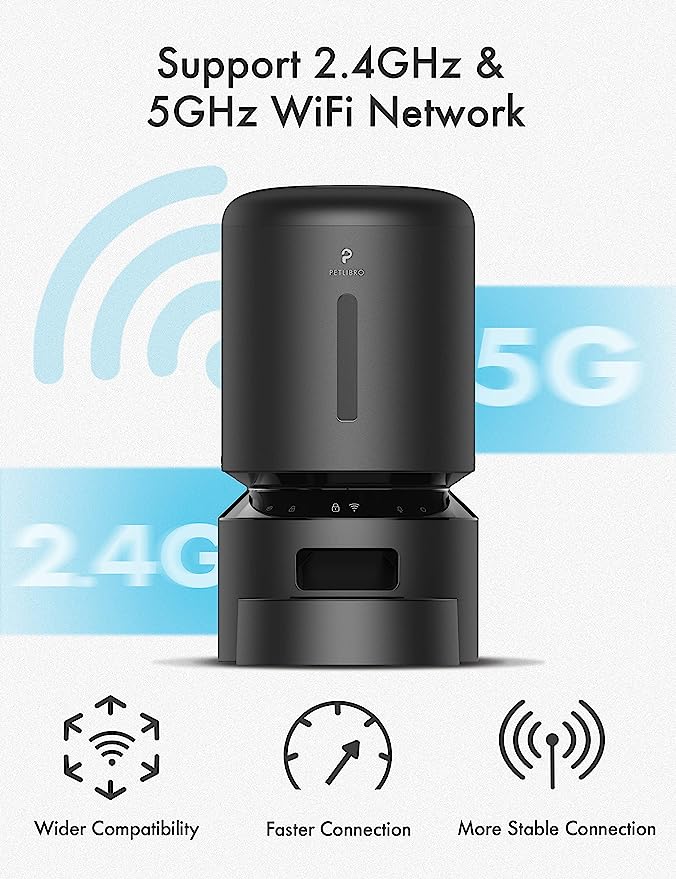 • Convenient APP Control: WiFi automatic cat feeder can connect to 5GHz and 2.4GHz WiFi network. Program and monitor your pet’s meals anywhere anytime through the PETLIBRO LITE App on your iOS or Android smartphone. You can set up to 10 meals per day with 1-50 portions per meal. You can check the feeding records to ensure your cat or dog has been fed on a set schedule by APP and also can be controlled from multiple family members’ smartphones.