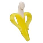 • Start teaching your baby good brushing habits with the Baby Banana Toothbrush! This training toothbrush is designed specifically for infants’ and toddlers’ small, sensitive mouths. Intended to be introduced when babies first begin teething and they instinctively want to stick everything in their mouths. The soft silicone bristles will gently massage sore teething gums when the brush is rubbed against them.